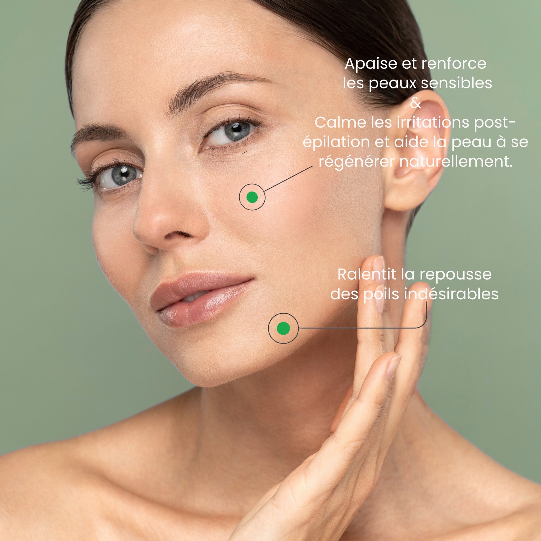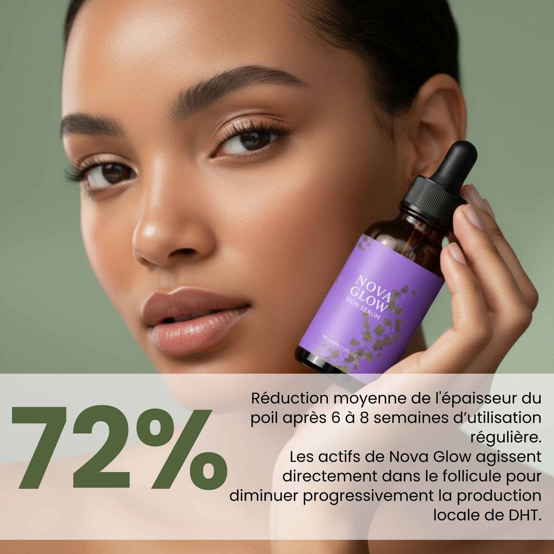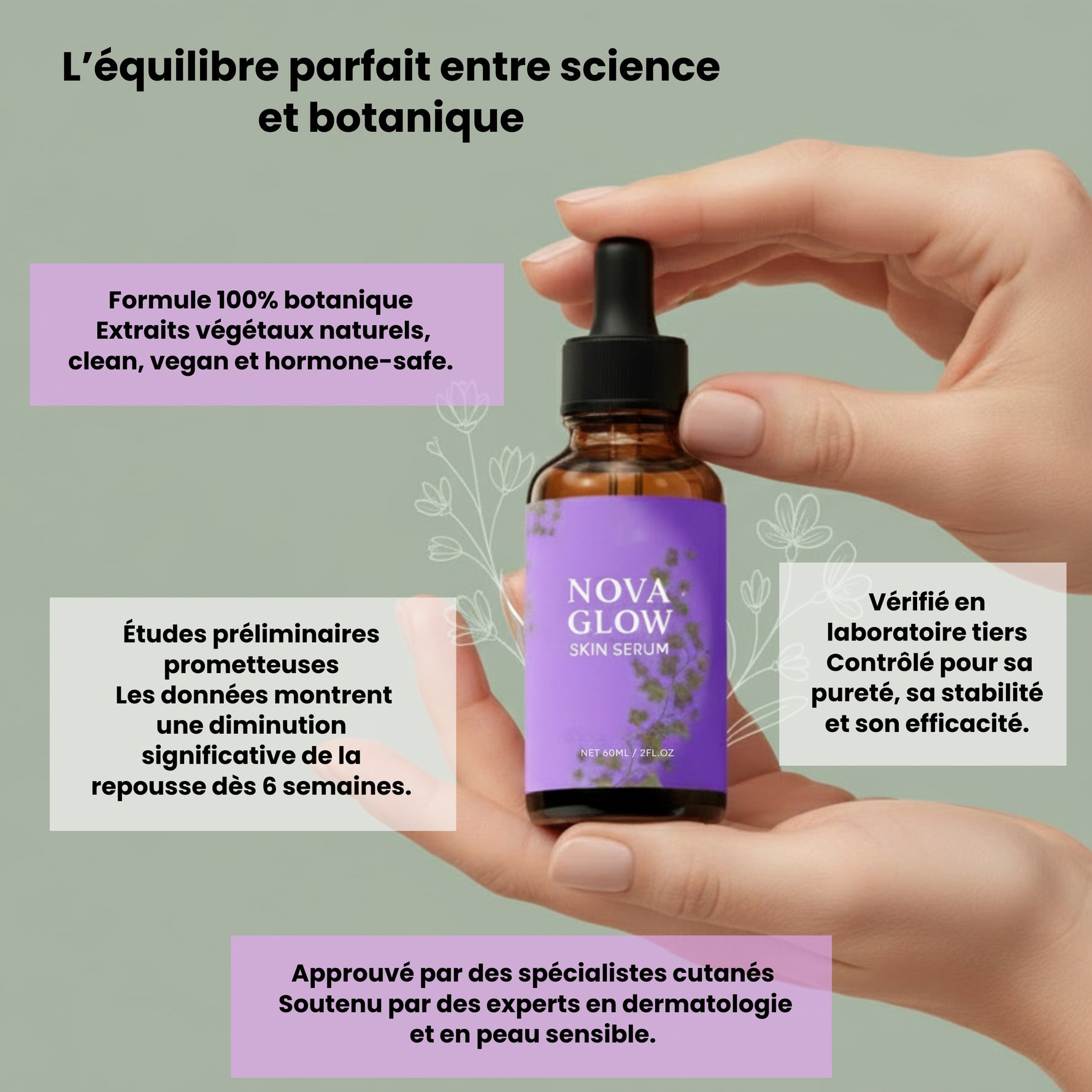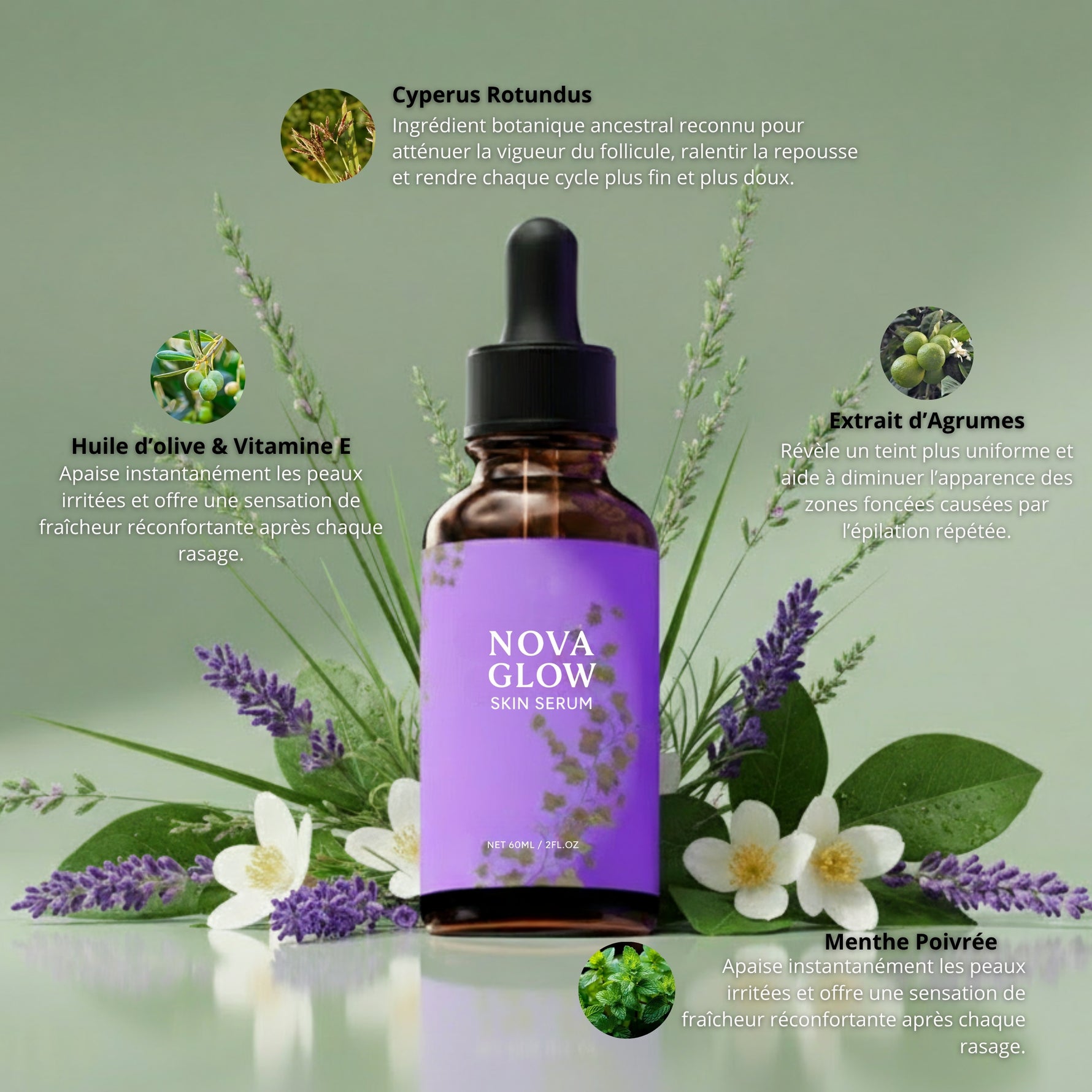 NovaGlow est un sérum botanique conçu pour ralentir progressivement la repousse des poils tout en apaisant et nourrissant la peau.